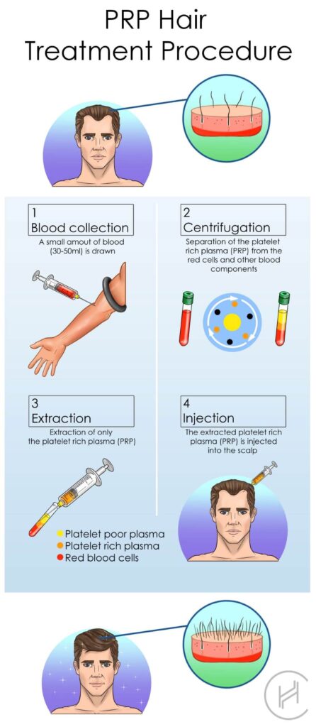 The PRP is injected into the scalp to stimulate hair follicles and hair regrowth.